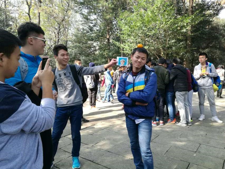 在签到点签到之后,有的队伍直奔肖劲光铜像纪念园,经过工作人员的指引,每个班顺利拿到五张表情卡片,他们在做出卡片上的表情的同时需在头上放稳一个橘子,由班上其他同学进行拍照,并制作成表情包。就这样,在同学们的欢笑声中顺利完成了一关。